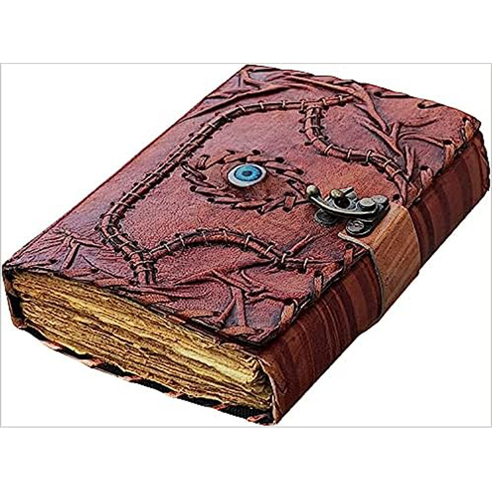 Handmade vintage leather journal with deckle edge paper grimoire third eye journal Antique blank spell Wiccan notebook leather horror special book of shadows daily lock clasp journal 7x5 inch contains 100recycled Deckle edge paper leaves (200 pages). The eye symbol is a powerful goddess symbol, often used for goddess who have triple aspects, especially lunar goddesses such as Hecate, Artemis, and Diana. Notebook features a brown thread binding, with embossed designs front and back. The book is approximately 7 inches tall, 5 inches wide, and 1.8 inches thick, and the pages are unlined. The concept is found particularly in the tantric traditions of Hinduism, Buddhism and Jainism. Notebook has an antique C lock to keep your secrets from prying eyes. Handcrafted journals contain acid free, handmade, archival Quality, linen - cotton parchment paper by a family owned company that has been in the handmade paper making business for almost 50years. This book is great for keeping by the bedside to jot down dreams, or for use as a diary or journal. This brand new journal makes an ideal gift for that special someone or simply to keep for yourself.