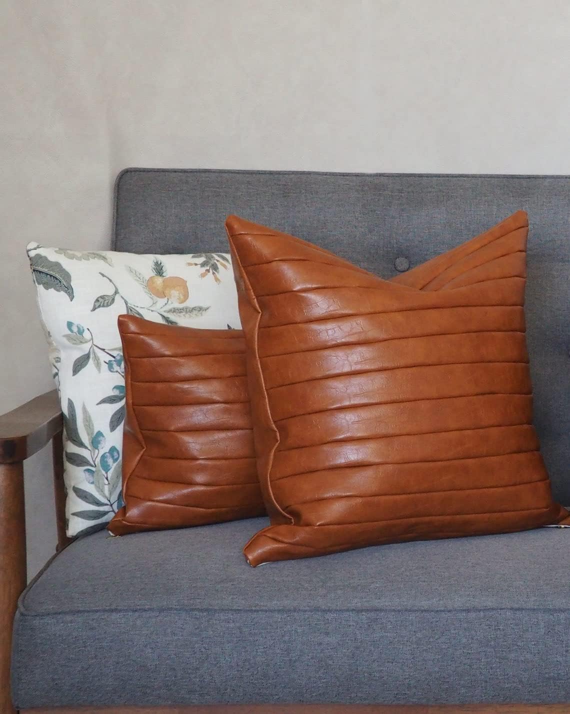 - Cross-Wise Stitched method of stitching gives the pillow a deserved beauty. You may use your pillows as back support or neck support during watching TV, relaxing in your courtyard. It helps to make it durable, long-lasting and retain its shape after use. Large patched leather cushion/cover can add so much texture to any space. Styling it with crisp linen on the bed or pairing it against other cushions on the couch, these cushions will always be a timeless statement piece.