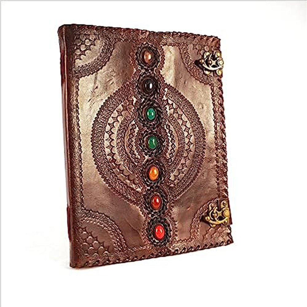 Seven chakra medieval stone embossed handmade genuine leather journal book of shadows notebook is very beautifully embossed and hand made 120 leaves (240 pages) notebook features a brown leather binding, with embossed designs on both front and back. The concept is found particularly in the tantric traditions of Hinduism, Buddhism and Jainism. They are conceived as an energy focal point, bodily functions or psychic node in the subtle body. The book is approximately 13 inches tall, 10 inches wide, and 1.2 inches thick, and the pages are unlined. Notebook has two antiqued brass swing clasp to keep your secrets from prying eyes. Handcrafted journals contain is non acid, handmade, archival Quality, linen - cotton parchment paper by a family owned company that has been in the handmade paper making business for almost 150 years. This book is awesome for keeping by the bedside to jot down dreams, or for use as a diary or journal. This brand new journal makes an ideal present for that special someone or simply to keep for yourself. (Due to screen resolution color of product may slightly vary from images shown.)